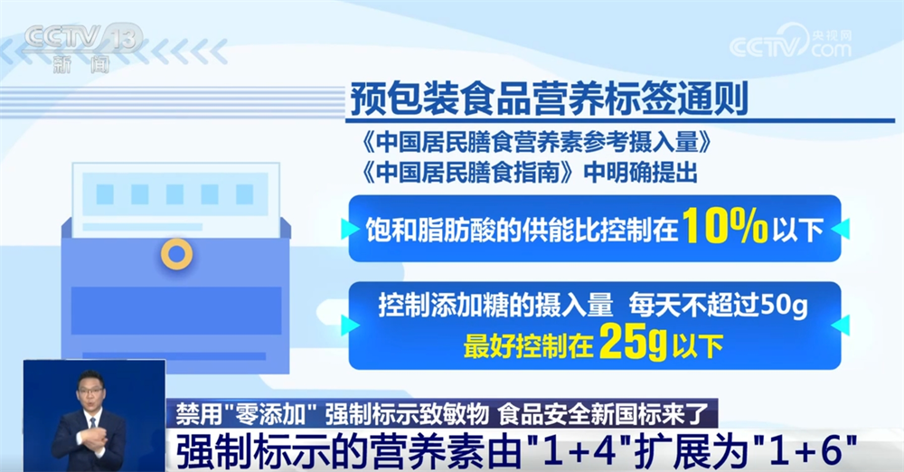 新的尺度将强制标示的养分素范畴由“1+4”,即能量和卵白质、脂肪、碳水化合物、钠扩展为“1+6”,添加的两项是糖和饱和脂肪(酸),便利消费者按照小我需要选择消费,节制能量和脂肪、糖等的摄入。据领会,《中国居平易近炊事养分素参考摄入量》和《中国居平易近炊事指南》中明白提出,“饱和脂肪酸的供能比节制正在10%以下”“节制添加糖的摄入量,每天不跨越50g,最好节制正在25g以下”。 同时,养分标签还要添加“儿童青少年应避免过量摄入盐油糖”提醒语。